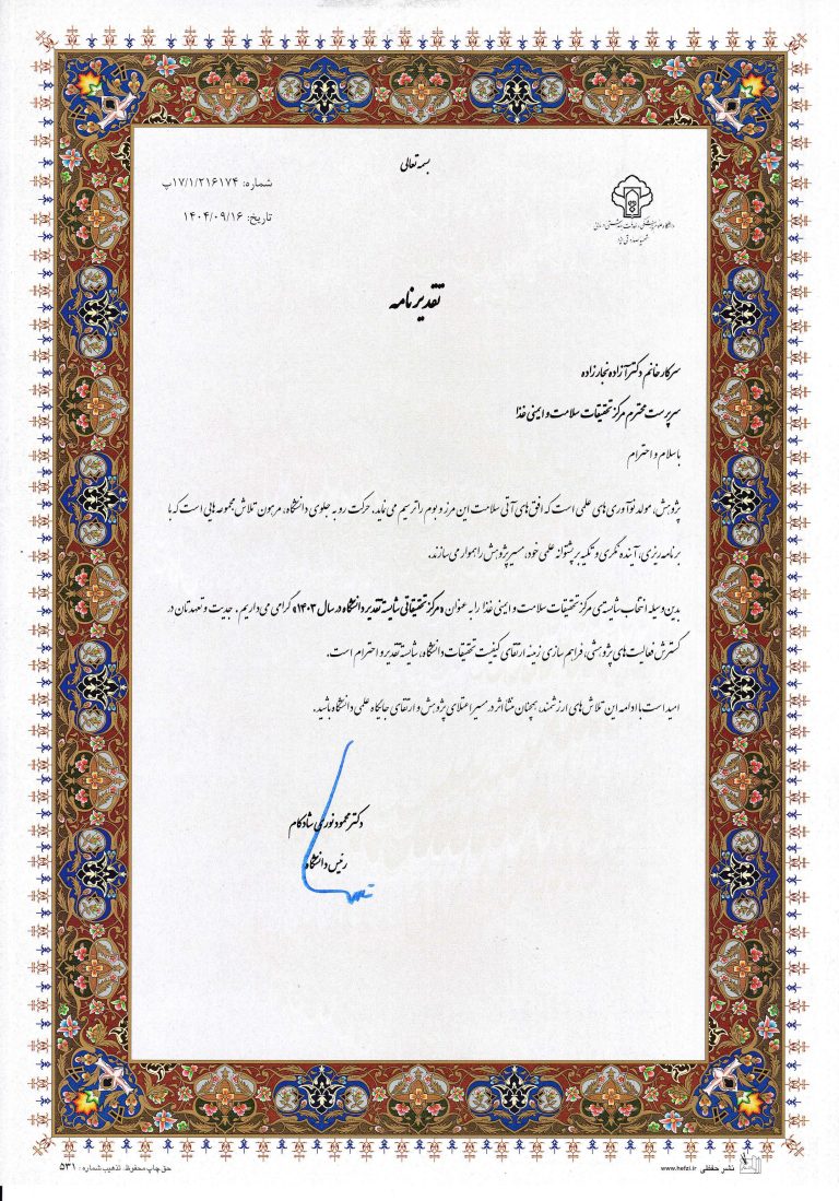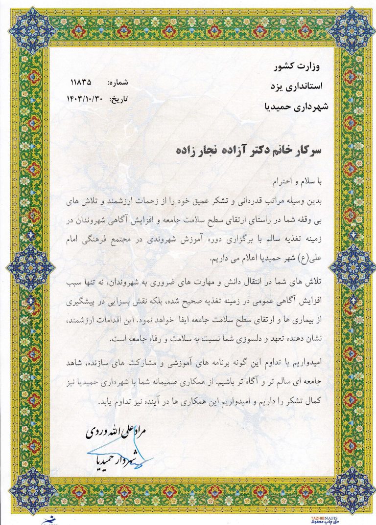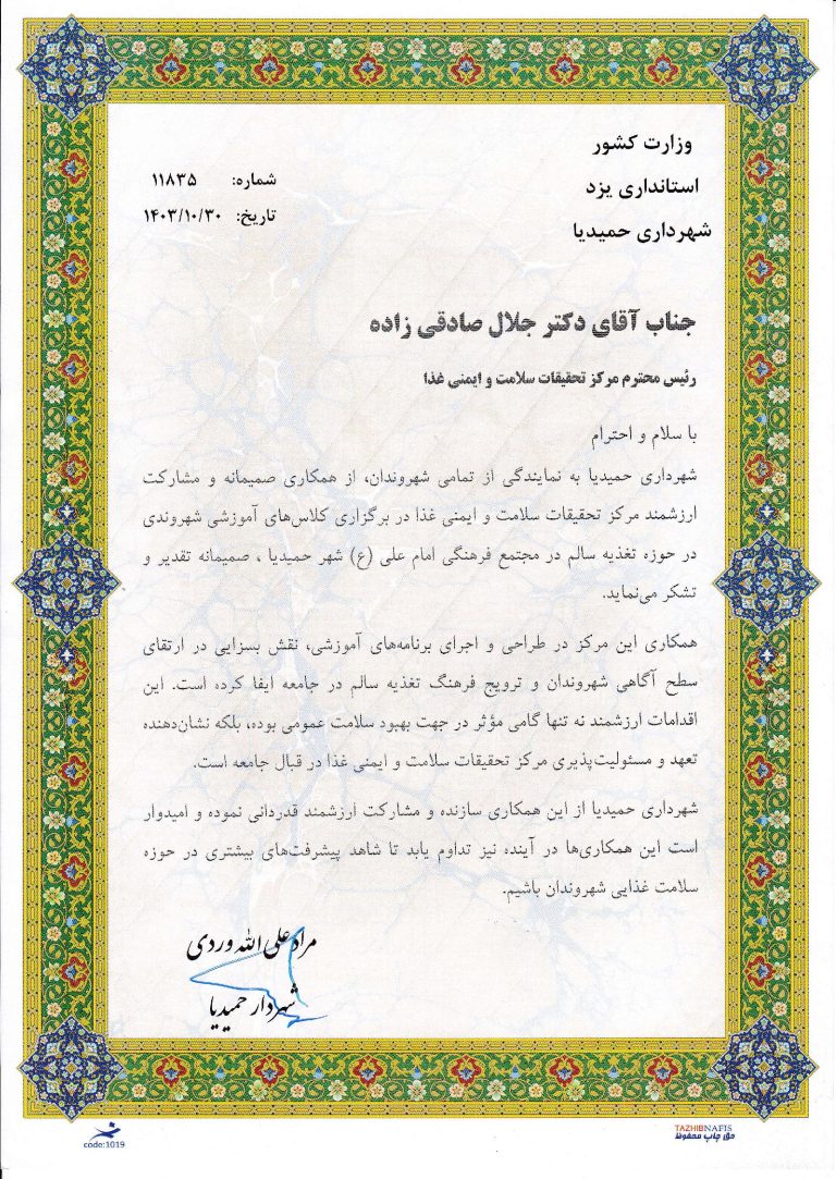 تقدیر و تشکر شهردار محترم حمیدیا یزد از رئیس و معاون پژوهشی مرکز تحقیقات سلامت و ایمنی غذا جهت طراحی و اجرای برنامه های آموزشی و برگزاری کلاس های آموزش شهروندی در حوزه ی تغذیه ی سالم